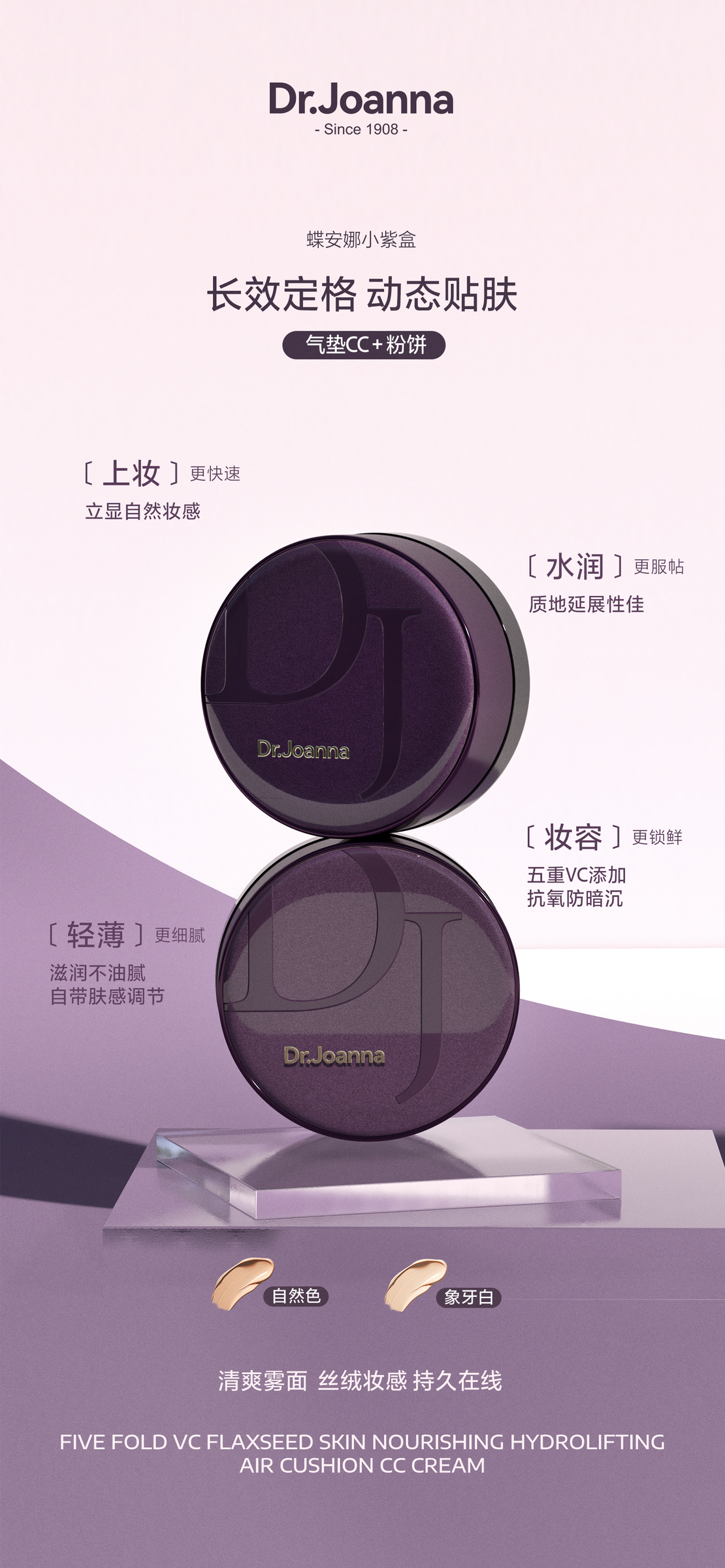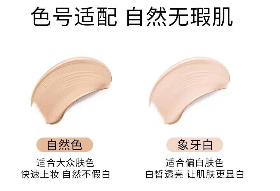 - 养肤型气垫:添加亚麻籽精华加强保湿抗衰、添加5重VC抗氧化提亮